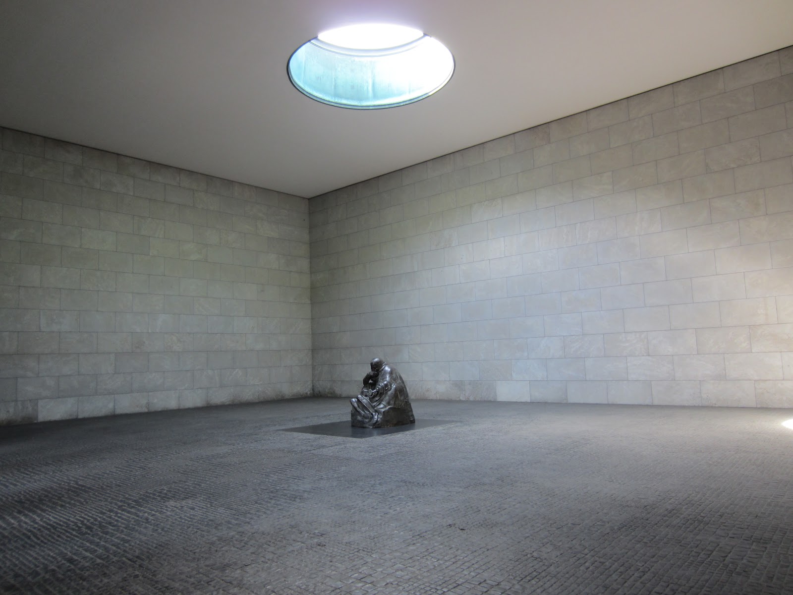The memorial to the victims of war and fascism. The statue of the mother and her dead son is directly under the oculus in the ceiling, so when it rains or snows the weather falls through the roof and onto the statue.