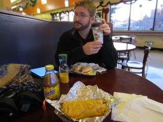Moe’s is a fairly popular place in Boulder (last year a second Moe’s opened up in another part of town) and if you go there between about 11:00am and 1:30pm you might spend a few minutes in line and have trouble finding a place to sit down inside. Eat from Moe’s a few times, however, and you’ll see why. The food is tasty and the bagel selection is wide enough that anyone can find something they like. Below is a picture of the table Eric and I sat at with our respective orders. He was having a breakfast bagel, I had a breakfast burrito. Note also the Yoohoo, a mysterious chocolate milk imitation product that doesn’t even taste all that good, but for some reason I felt like drinking that morning.