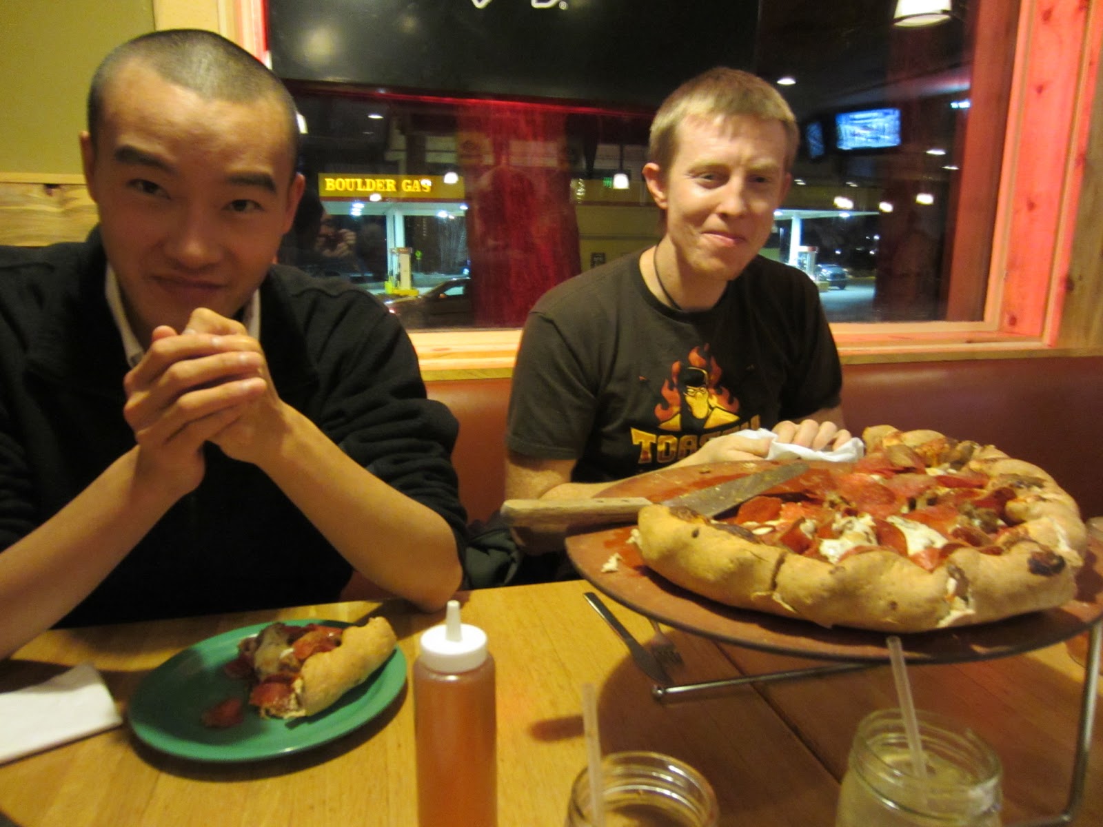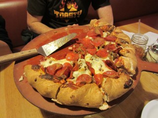 I cannot stress enough how filling these pizzas are. Their appearance is deceptive and you might think that you should have ordered a larger size when they bring your pizza out. Beware, these are not the sort of pizzas you get from the likes of Dominos or Papa John’s where a young male can easily devour a medium size pizza in a single sitting. Beau Jo’s pizzas are not the biggest, but are very filling. The pizza shown in the photos above that my friends and I ate was packed with toppings and it was a team effort by all of us to consume the whole thing. For those of you who scoff at our small stomachs, you can always prove your manhood by taking “the challenge”, which is an actual menu option. If you choose to do so, you will be served a 14 pound pizza and given one hour to eat it (you are allowed a partner to help, which is recommended). Successfully consuming the whole thing within one hour means the pizza is free and you get recognition for beating the challenge. Failure results in you having to pay for the pizza, which I believe costs about $80.
