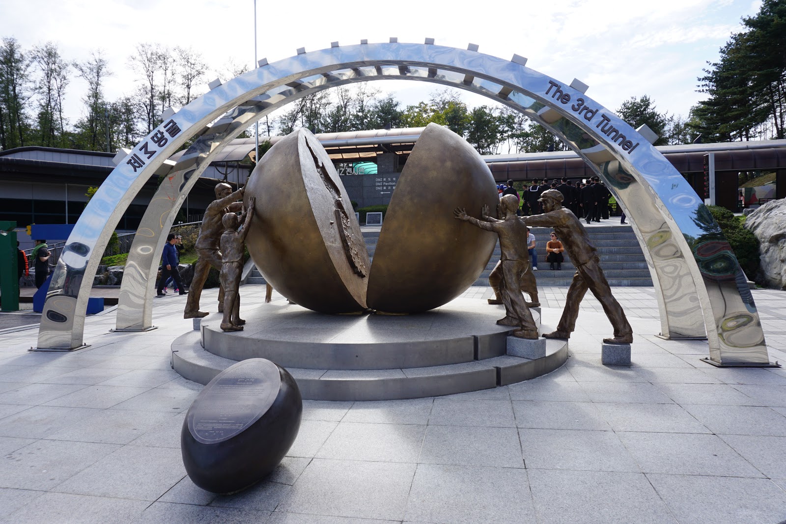 The final part of our tour that day was a visit to the Third Tunnel. In the years after the signing of the ceasefire that (mostly) ended the Korean War, the North Koreans dug multiple tunnels under the border that would have allowed them to funnel thousands of troops into South Korea in the event of war breaking out again. The Third Tunnel was the third such tunnel that the South Koreans discovered, hence the name. It is deep underground and getting to it involves a long walk down another tunnel that South Korea dug so that people could go down and see it. No one’s sure just how many of these tunnels exist and it’s thought that there are many more that haven’t been discovered yet. No photos are allowed in the Third Tunnel, so I have nothing to show you of it, but I can give you this photo of the unification monument just outside of the tunnel’s entrance. Koreans are pushing two halves of a sphere back together, with South Koreans on the left and North Koreans on the right.