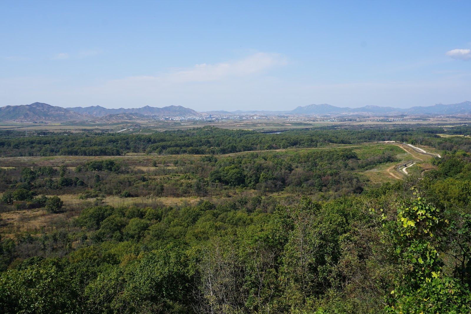 After a lunch break our tour proceeded to a lookout post from which we could stare out onto North Korea. The border line curves back and forth across the land, but it’s not too hard to tell where the North Korean side is because North Korea cut down most of the trees on its side of the border, both for fuel and to create an open no-man’s land. The rail line from Dorasan Station could be seen off to the left and to the right you could see the giant North Korean flagpole tower and the empty village that they use to broadcast propaganda across the border. Far off in the distance was North Korea’s third largest city, whose name escapes me at the moment. It had a number of taller buildings, though from what we were told, none of them have elevators because North Korea can’t generate the electricity that would be needed to power them. South Korean propaganda music was playing over nearby loudspeakers, so this might have been what I heard at the JSA but I’m not sure. It was an odd feeling to be staring out at what is probably the most repressive country on the entire planet. To this day I still can’t quite describe it.