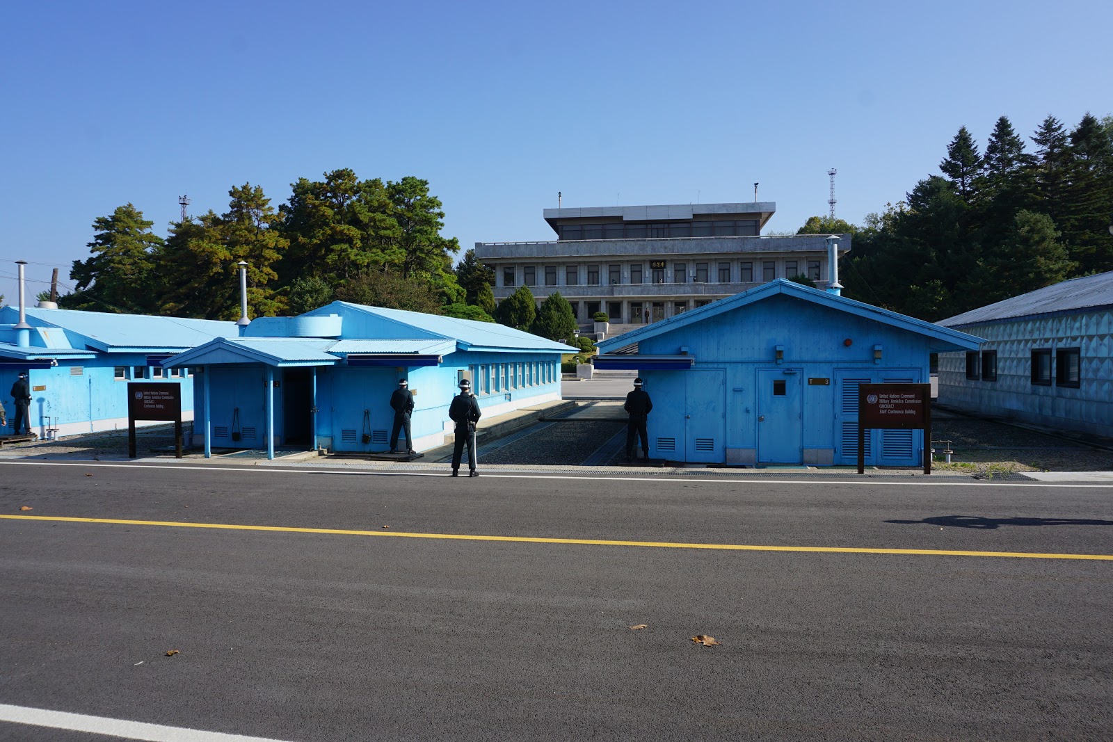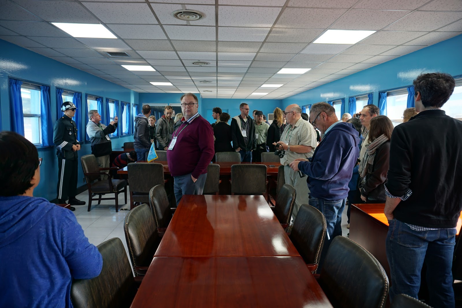 We next entered one of the blue meeting houses. Inside are tables and chairs used during talks, and since it sits right on the border you are technically inside North Korea if you walk to the far side of the room. A pair of South Korean guards keep watch over the room and we were told not to interact with or stand directly next to them. I walked to the far side and thus entered North Korean territory, however inside that room it doesn’t really hit you that you’re in North Korea. Below is a photo of what the room looked like.