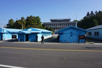 On my final full day in Seoul I took a tour of the Korean DMZ that was organized by the USO and a company called Koridoor. Understandably, you can only visit the DMZ as part of a tour group, seeing as how the Korean border is a highly controlled and potentially dangerous place. It’s only a 45 minute bus ride from Seoul to the DMZ, which really gives you a good understanding of just how close South Korea’s capital is to the border and why Seoul would likely be badly damaged if war ever broke out. The first part of our tour took us through Camp Bonifas and we passed near a village that’s close to the DMZ. From what we were told, the villagers are farmers who are paid by the government to cultivate the land and are completely exempt from taxation and military service, however they also don’t have as many freedoms as other Koreans and have hardly anything to spend their money on. Soon we came to the Joint Security Area (JSA) where the two Koreas actually meet. The DMZ extends for two kilometers in either direction from the border and is full of mines, but at the JSA there is a small cluster of buildings right on the border that are meant to facilitate talks between the two nations. Blue buildings belong to the United Nations and gray buildings belong to North Korea. Right on the border itself are six meetinghouses: three blue and three gray. A concrete slab in the middle of that row of six buildings marks the border. About 100 yards away from us, in front of a large building we could see a single North Korean guard. In reality there are many more North Koreans at the DMZ, however nearly all of them are out of sight. One of those hidden guards is apparently in the building right behind the visible North Korean guard there is a second guard whose only job is to shoot the visible guard if the visible guard ever tries to make a run for it and defect. In the distance I could hear some sort of music playing, which I assume was propaganda music but I don’t know which side was playing it. Since we couldn’t move around much I wasn’t able to get the angle I wanted for my photos, but I got a few half decent shots like the one below.