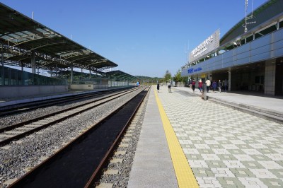 Soon our time was up and we had to leave the JSA. As we were walking to our bus I saw a very expensive BMW pull up and a civilian got out. The soldier who was walking with us had explained earlier at Camp Bonifas that the villagers who live near the DMZ oftentimes buy fancy cars because those cars are among the very few luxuries they are actually able to purchase, so I assume that civilian was one of the people living by the DMZ. The next place our bus took us to was Dorasan Station, the final South Korean train station on the train line that used to connect North and South Korea but is currently not in service. South Korea still hasn’t given up hope on Dorasan one day being in use again, so it’s kept very tidy for a place whose only visitors are tour groups like mine. Out on the train platforms you can see a train car that was imported from Germany that was originally used as a peace car during the Cold War. South Korea used it during the years that the train line operated but now it sits outside as a mini-museum.